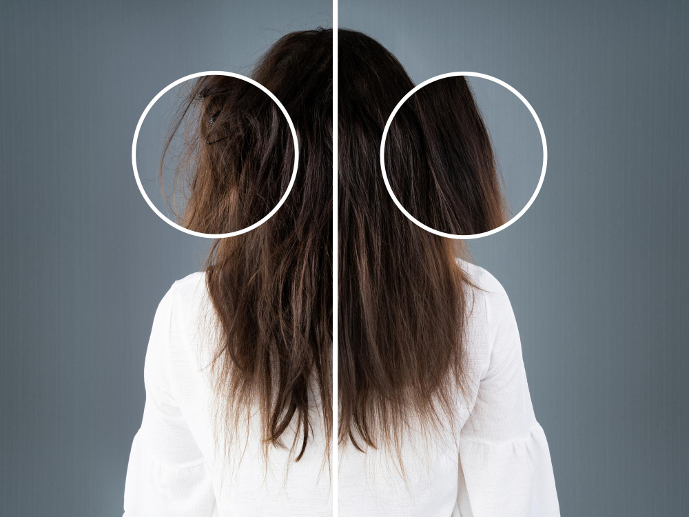 El exceso de humedad penetra en la fibra capilar, provocando una hinchazón irregular que rompe la uniformidad del cabello. - Daño en la fibra capilar