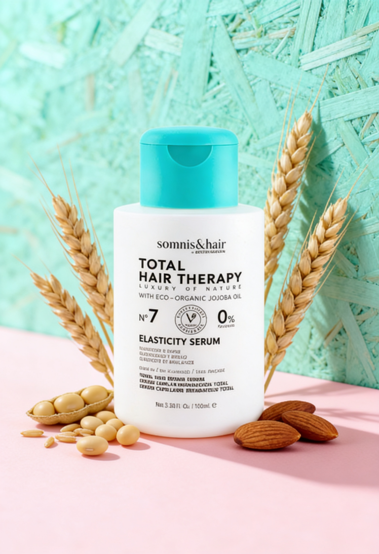 El Sérum Restaurador Total Therapy de somnis&hair, enriquecido con activos de origen natural como el aceite de jojoba ecológico, actúa desde el interior de la fibra capilar.